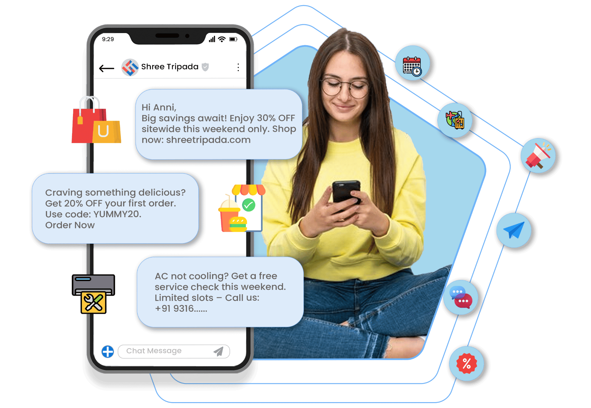 Capta la atención de tus clientes en un canal que es imposible de pasar por alto. El marketing por mensaje de texto te permite enviar SMS en masa, así puedes enviar campañas de mensajes de texto promocionales como ráfagas pero con un fin específico. También es genial para: